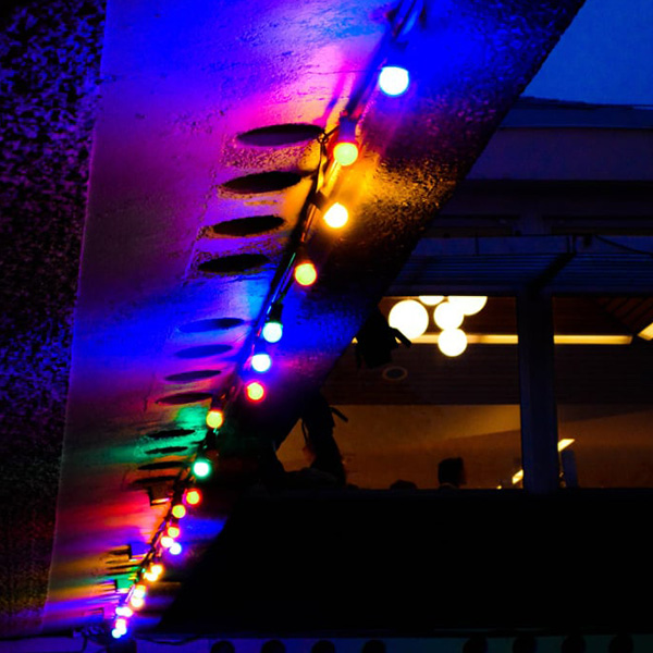 Les guirlandes multicolores Ma Guinguette proposées en location sont d'une longueur de 10 mètres pour 20 globes ampoules E27. Connectables entre-elles sur plusieurs centaines de mètres permettant de réaliser l'éclairage complet d'un événement sur une simple prise 16A. Le câble supporte une puissance de 2200w. L'espacement entre les ampoules est de 50 cm afin de conserver une mise en lumière homogène. La guirlande multi teintes est composée d'ampoules leds ? globe leds : bleues, rouges, vertes, oranges, roses, jaune, blanc chaud, blanc froid ... pour une faible consommation. Ces guirlandes multi-couleurs électriques répondent ? la norme IP44, vous donnant la possibilité de faire des mises en éclairage en extérieur comme en intérieur. Idéal pour un diner dehors en plein été avec l'ensemble de vos convives, cette guirlande multi couleurs surprendra tout le monde.
