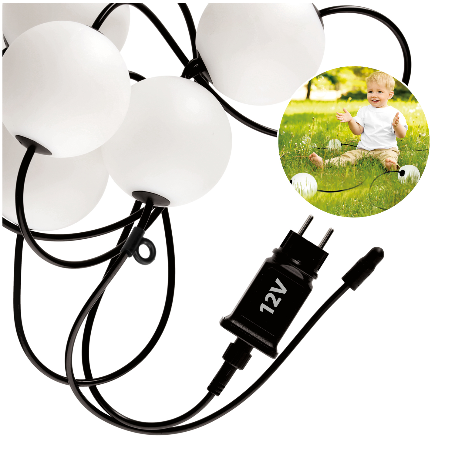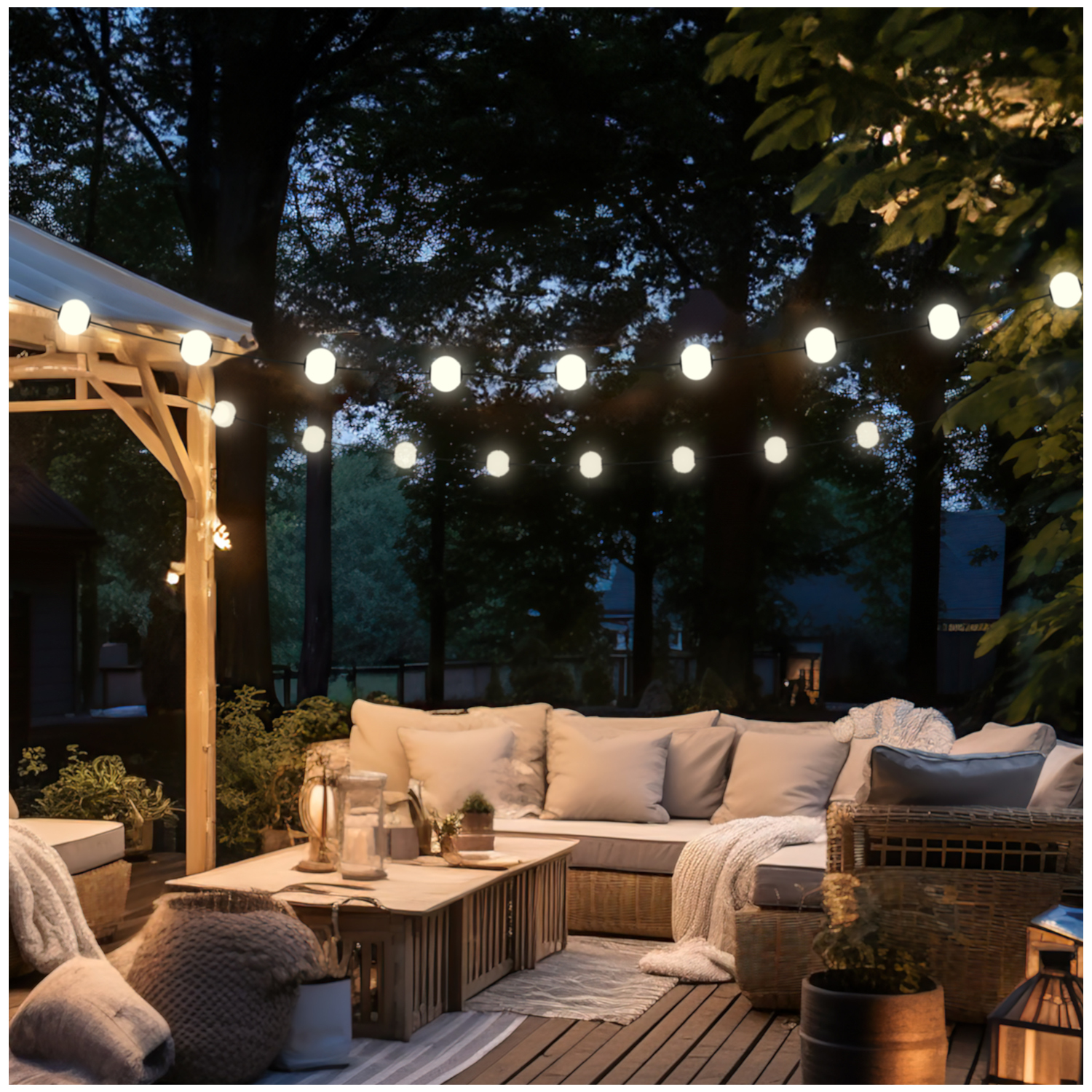 Notre Guirlande Guinguette 10 Boules 10CM extérieur IP67 LED blanc chaud s'inscrit dans notre gamme de produits professionnels, alliant esthétique et performance. Avec une longueur de 7 mètres, elle habille vos espaces, qu'ils soient intérieurs ou extérieurs, en apportant une touche lumineuse raffinée.