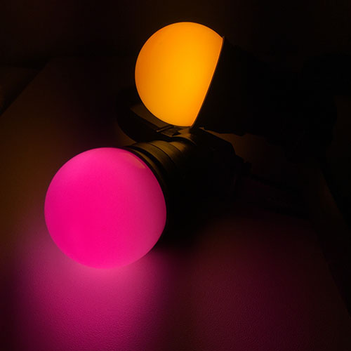 ? Les guirlandes double couleurs Ma Guinguette proposées en location sont d'une longueur de 10 mètres pour 20 globes ampoules double teintes E27. Connectables entre-elles sur plusieurs centaines de mètres permettant de réaliser l'éclairage complet d'un événement sur une simple prise 16A. Le câble supporte une puissance de 2200w. L'espacement entre les ampoules bi coloris est de 50 cm afin de conserver une mise en lumière homogène. La guirlande est composée d'ampoules leds ? globe leds bicolores pour une faible consommation. Ces guirlandes répondent ? la norme IP44, vous donnant la possibilité de faire des mises en éclairage en extérieur comme en intérieur. Idéal pour un diner dehors en plein été avec l'ensemble de vos convives.